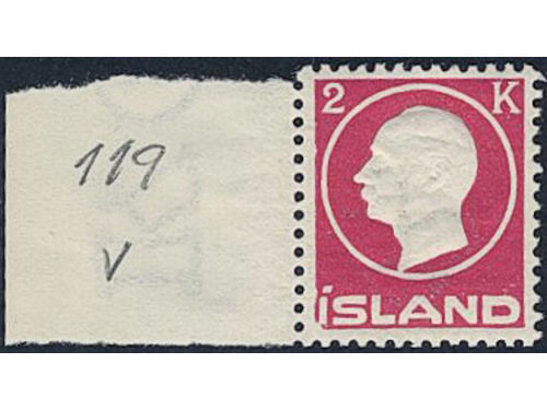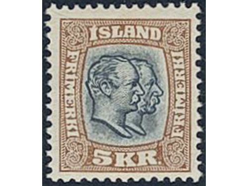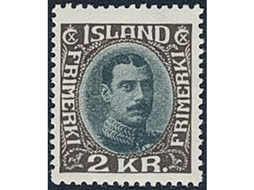 Iceland. Facit 119v ★★, 1912 King Frederik VIII 2 Kr rose with lower left corner cut off variety (pos 81). Margin copy. Good centering. SEK 1500 Show less