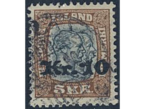 Iceland. Facit 107 used, 1930 Surcharge on Two kings 10/5 Kr blue-grey/brown. Good centering. Certificate Lasse Nielsen. SEK 5000
