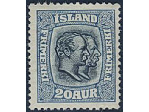 Iceland. Facit 97 ★★, 1918 Two Kings 20 aur blue wmk cross. Cert Lasse Nielsen. SEK 7500 Show less