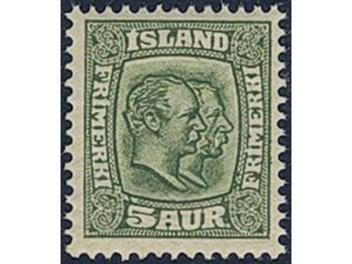 Iceland. Facit 174v1 ★★, 1930 The Parliament 5 aur green/blue with white sunrays and waves variety. Very fresh example. SEK 2000