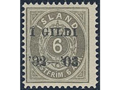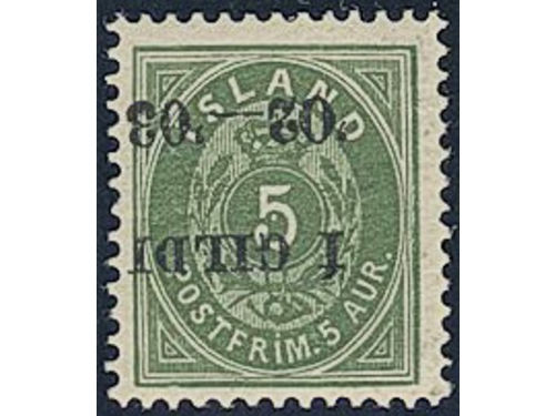 Iceland. Facit 51v1 ★★, 1902 Surcharge “Í GILDI” 5 aur green perf 12¾, black inverted overprint. Fresh. SEK 4000 fo..
