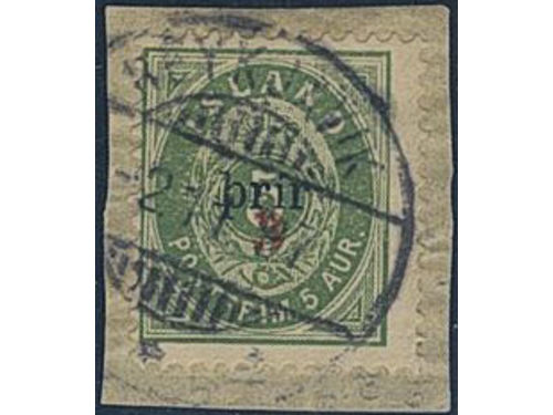 Iceland. Facit 35 used, 1897 “þrir” Surcharge 3 þrir large letters, perf 12¾ on small piece. Cert. Lasse Nielsen. SEK 6500