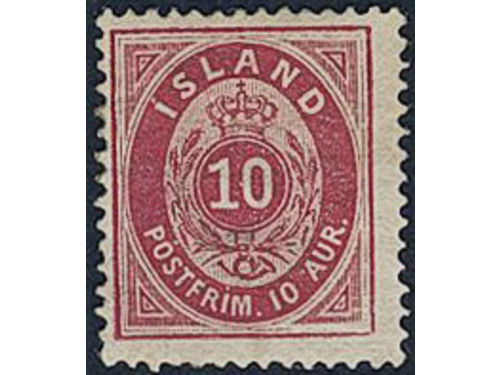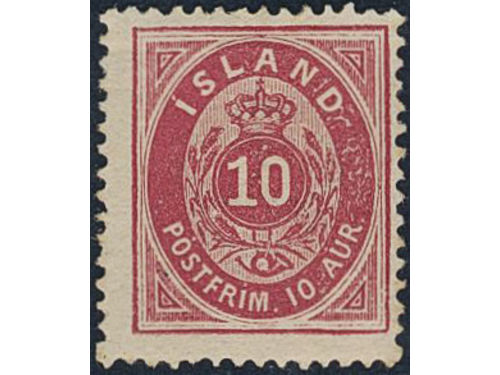 Iceland. Facit 12 ★, 1876 Aur values 10 aur carmine, perf 14 × 13½. Small black paper remains on back side. SEK 2000 Show less