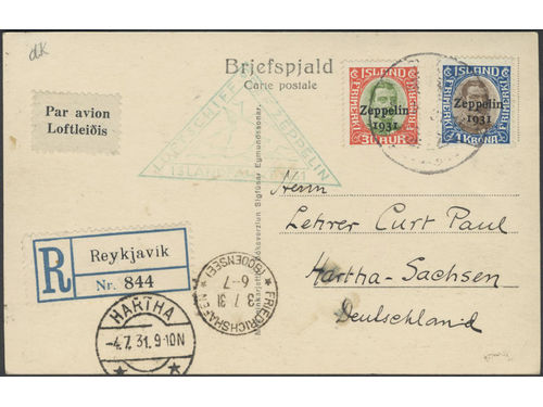 Iceland. Facit 162, 167 on cover, 1931 "Zeppelin 1931" overprint 30 aur green/red and 1 kr brown/blue on registered postcard to Germany. Correct postage. Show less