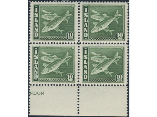 Iceland. Facit 245 ★★, 1940 Fishes and Flag 10 aur green in nice block of four with margin. SEK 3600