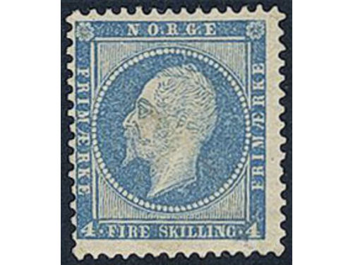 Norway. Facit 4 ★, 1856 Oscar I 4 skilling blue. Thin, two folded corner perfs. SEK 4000