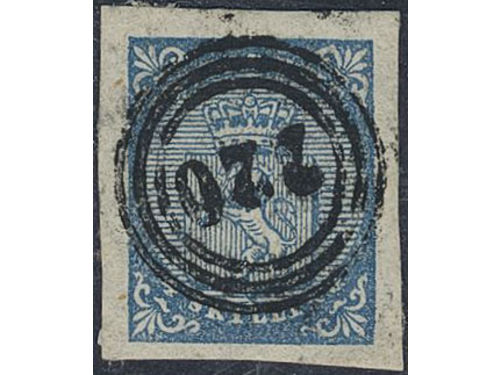 Norway. Facit 1c used, 1855 Coat-of-Arms 4 skilling blue (1). With 3-circle cancellation 220 (unusual) delivered from July 1856 to July 1858. SEK 1400 Show less