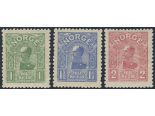 Norway. Facit 90–92 ★★, 1907 Haakon VII profile I SET (3). 1.50kr signed Moldenhaer. Slightly dried gum on all 3,. SEK 8600