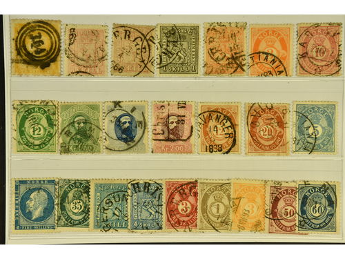 Norway. Used 1855–1885. All different, e.g. F 2, 9–12, 16, 23, 27–28, 34–36, 42. Mostly good quality. F SEK 6790 (23)