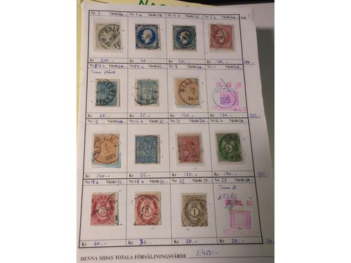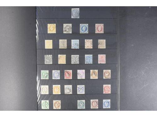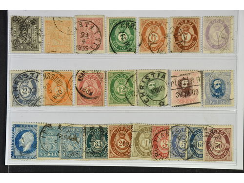 Norway. Used 1856–1878. All different, e.g. F 11–12, 15–17, 19–21, 23, 27–28, 34–36. Mostly good quality. F SEK 6955 (24)