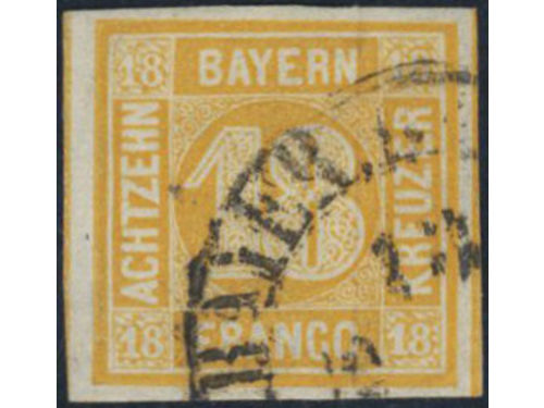 Germany, Bavaria. Michel 7 used, 1850 18 kr yellow-orange. Good margins. EUR 240