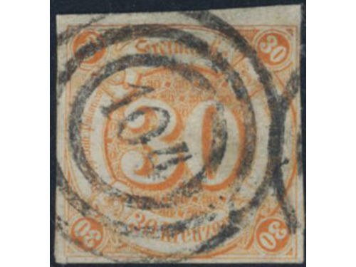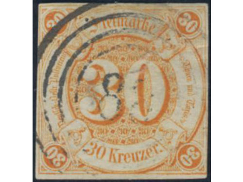 Germany, Thurn und Taxis. Michel 25 used, 1859 Numeral type 2nd issue 30 Kr orange. Near cut, with old sign. EUR 320 Show less
