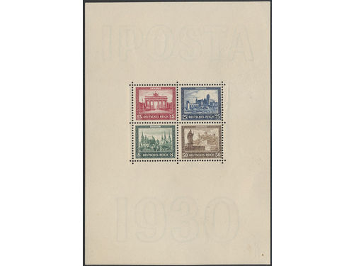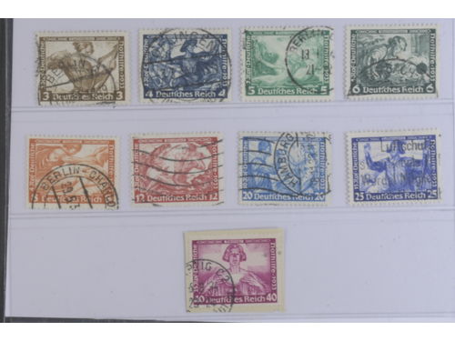 Germany, Reich. Used. Well-filled collection 1872–1945 in two Kabe albums with slip cases incl. 23 Shields, Mi118, good Inflation stamps, nice Air- and charity stamps incl. Mi438, 457, 497–98 and cpl. Wagner, cpl. souvenir sheets 3–11 incl. OSTROPA, official stamps, etc. Apparently cpl. in main numbers 1934–45. Please see a selection of scans at www.philea.se. Show less
