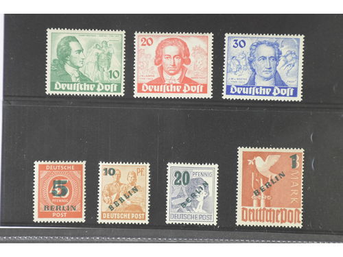 Germany, mixed. ★★/★/⊙. Collection 1872–1952 in Yvert album incl. e.g. Berlin Mi1–90 cpl. * and s/s1, BRD Mi111–47, Reich incl. e.g. Mi695–97 used and six souvenir sheets, Allied occupation, DDR and Soviet zone incl. souvenir sheet Goethe, etc. Please see a selection of scans at www.philea.se. Approx. 10 kg. (1600) Show less
