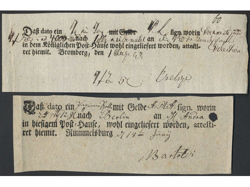 Germany, Prussia. Postal form. Two receipts for registred postal items from 1780 and 1794 from Hummelsburg and Bromberg, Western Prussia.