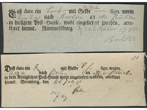 Germany, Prussia. Postal form. Two receipts for registred postal items from 1780 and 1794 from Hummelsburg and Bromberg, Western Prussia. Show less