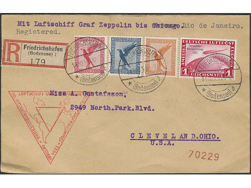Germany, Reich. Michel 496, 530, 532, 535 on cover, 1933 Graf Zeppelin – World Exhibition in Chicago 1 RM red. Eagle 10, 20, 50 pf on cover SÛDAMERIKA-CHICAGO FAHRT 1933, arrival mark TARDE-RIO 18.X.33. Show less