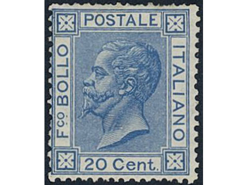 Italy. Michel 26a ★, 1867 Victor Emanuel II 20 c blue. Short perfs in top. EUR 750 Show less