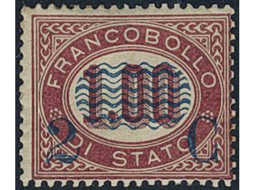 Italy. Michel 36 ★, 1878 New value overprint 2 c / 10 L dark lilac-red. One minor shor perf. EUR 500 Show less