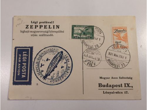 Hungary. Air mail cover, Michel 478+430, Zeppelin 1p on card with 12f green Turul bird. Show less
