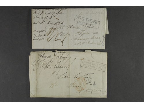 India. Covers. Four letters, amongst many other postmarks representing Deal, India letter, India letter Liverpool, India letter Plymouth, and India letter Ireland. Contents unread, as far as we can see, every cover has a postage due applied, 1830s, a lovely quartet. Show less