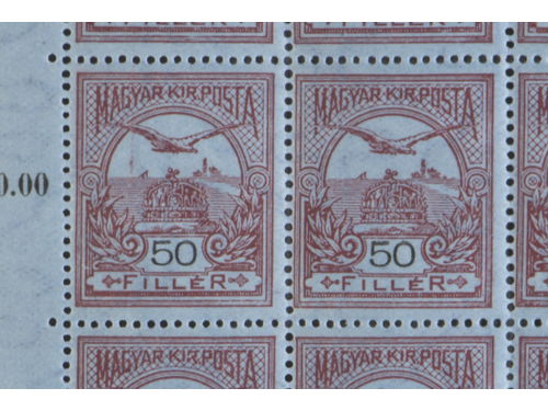 Hungary. Michel 120F ★★, 1913 Turul and king Franz Josef 35 f lilac-red/black on blue variety wmk 7. The wrong cliché row 2, stamp 3, 35 for 50 in a sheet of 100. A popular error. Complete sheet of 100. Show less