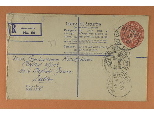 Ireland. Postal stationery. A comprehensive collection, more often than not used of elusive postal stationery from early issues, including the Harp registered different values such as 9d, 1/-onwards in 2 volumes. Many of these were bought as individual items in auction. All in all there are 130 items, many of which are extremely scarce with low printing numbers. Show less