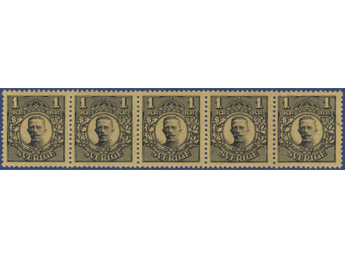 Sweden. Facit 96bz ★★, 1 kr with watermark KPV in a beautiful strip-of five. SEK 14000++