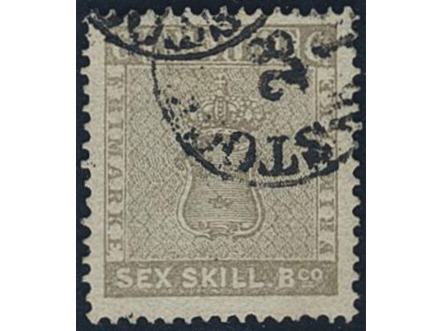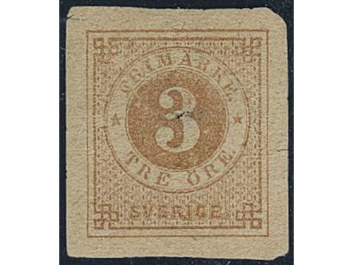 Sweden. Facit 3f used, 6 skill grey-brown on medium thick paper. Beautiful and well centered example with cert. M Nilsson 2, 3–4, 1. SEK 13000