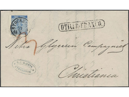 Sweden. Facit 9 on cover, 12 öre blue on beautiful cover with contents sent to Norway. Canc. STOCKHOLM 21.3.1867 and OTILLR.FRANCO in frame.