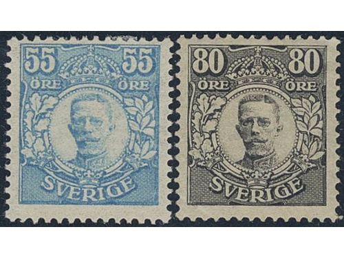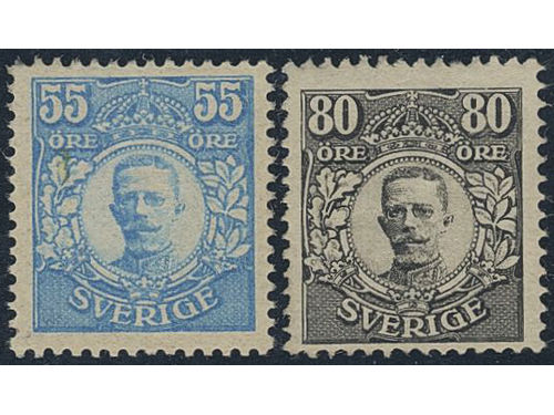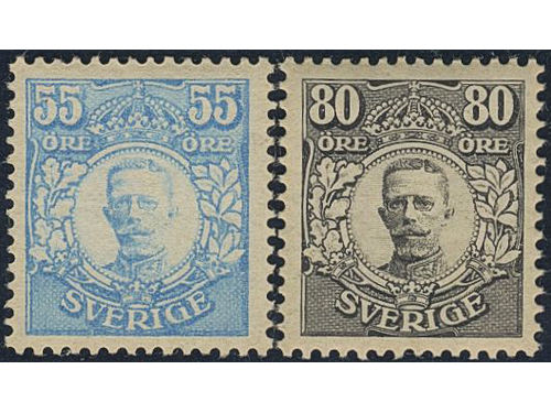 Sweden. Facit 92, 94 ★, 55 och 80 öre (2). Cert N. Svensson 2,3,3 and HOW 2,3,4. Both with light corner crease. Two nice examples.
