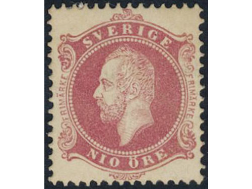 Sweden. Facit 36b ★, 50 öre carmine-rose. Superb example with EXCELLENT centering. The gum somehat moisture affected. Very scarce shade in this quality. Certificate HOW 4, 5, 3 (2007). Show less