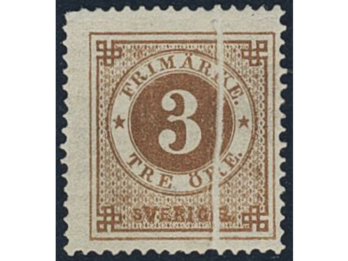 Sweden. Facit 17v6 ★, 3 öre brown, paper folded before printing. Small imperfectins of less importancance. Very rare var..