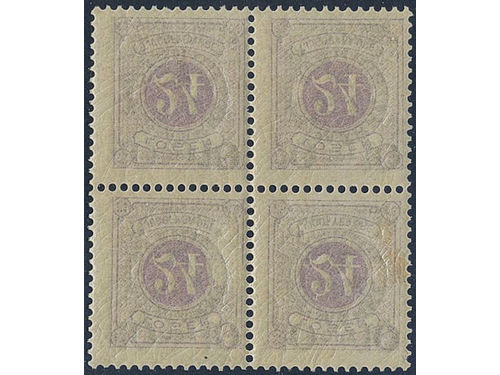 Sweden. Facit 121b v5 ★★, 1916 Landstorm II 10+40 / 24 öre reddish lilac in BLOCK OF FOUR, with SET-OFF on all four stamps. Very scarce variety on this stamp, previously not recorded. Exhibition item. Certificate Lorentzon 3, (4×3), 4×5) (2025). Show less