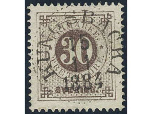 Sweden. Facit 25a1 used, 30 öre dark reddish brown on translucent paper. Beautiful example cancelled TIERP 1.10.1872. Very scarce shade. Signed by O.P. SEK 5000 Show less