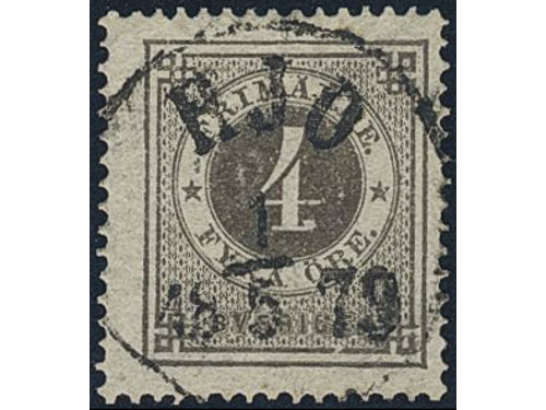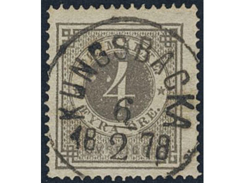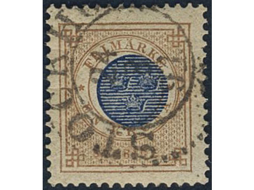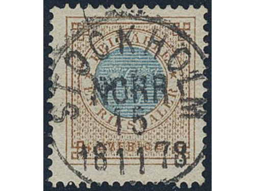 Sweden. Facit 37 used, 1 Riksdaler brown/blue. Superb example cancelled STOCKHOLM NORR 15.11.1878. Certificate HOW 4. 3. 5 (1999). SEK 8000