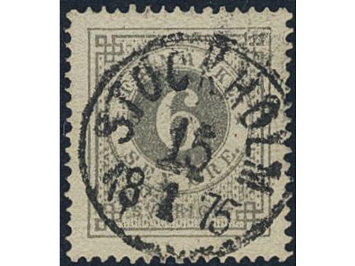 Sweden. Facit 20g used, 6 öre olive-grey. Superb–EXCELLENT cancellation STOCKHOLM 15.1.1875. Signed by O.P.