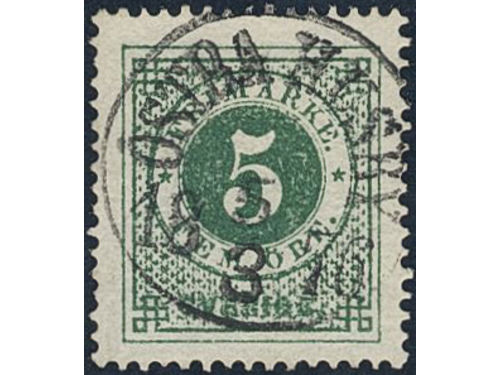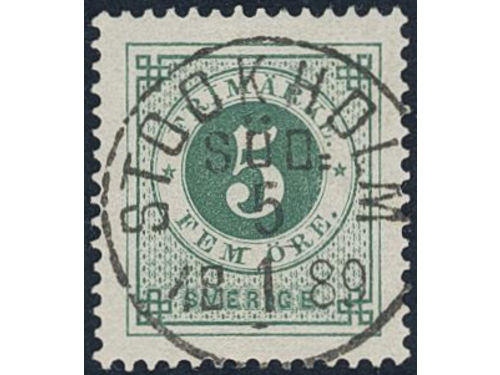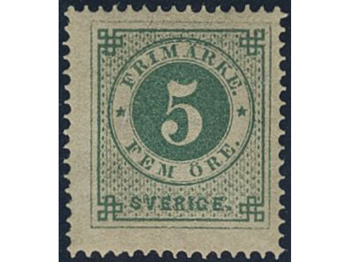 Sweden. Facit 19f v6 used, 5 öre dark green, grainy print, carton paper variety. Signed by O.P. Show less
