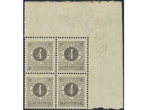 Sweden. Facit 29 ★★, 4 öre grey in block of four with corner sheet margin. Toned, partly disturbed gum, traces of hinge in margin. SEK 32500 Show less