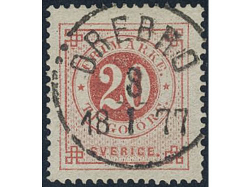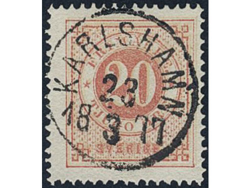 Sweden. Facit 23c used, 20/20 öre dull red on pale orange. EXCELLENT cancellation KARLSHAMN 23.3.1877. Show less