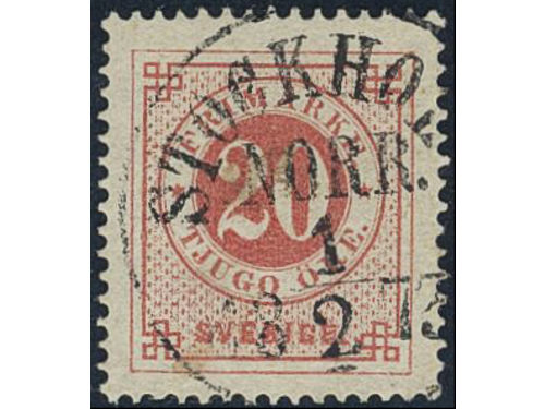 Sweden. Facit 22a used, 20 öre orange-red on yellowish paper. Superb cancellation STOCKHOLM NORR 1.2.1873. Signed by O.P. Show less