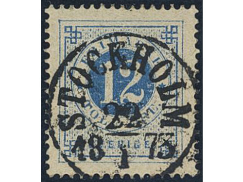 Sweden. Facit 21h used, 12 öre clear blue on yellowish paper. EXCELLENT cancellation STOCKHOLM 22.1.1873. Signed by O.P.