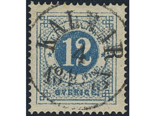 Sweden. Facit 21b used, 12 öre dull ultramarine-blue on yellowish paper. EXCELLENT cancellation STOCKHOLM 3.10.1872. Signed by O.P. Show less
