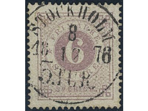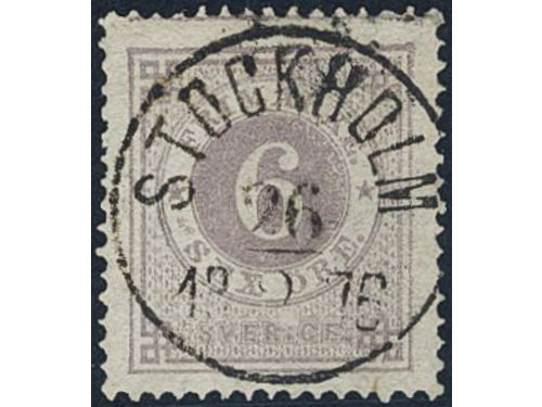 Sweden. Facit 20j v8 used, 6 öre lilac, coloured line in margin variety. EXCELLENT cancellation STOCKHOLM 26.2.1876. SEK 700