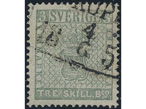 Sweden. Facit 1b used, 3 skill bluish green (small thin spot, some short perf). Canc. STOCKHOLM 20.11.1855 (owner mark on reverse). Cert. Mats Nilsson: 1, 1, 3. SEK 50000 Show less