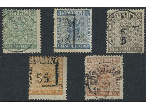 Sweden. Facit 1–5 used, 3–24 skill bco SET (5). Two with certificate: 3 skill bco, 1a HOW 1.2.3 and 24 skill bco, 5a N. Svensson 1.4.3. Show less