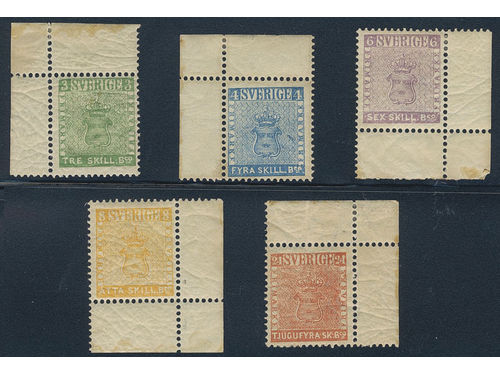 Sweden. Facit 1–5 used, 3–24 skill bco SET (5). Two with certificate: 3 skill bco, 1a HOW 1.2.3 and 24 skill bco, 5a N. Svensson 1.4.3.