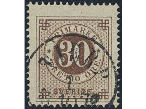 Sweden. Facit 35v1 used, 30 öre brown, imperf variety, with three wide margins. Small fold and tear. Certificate HOW 1, 3, 1 (2011). SEK 25000