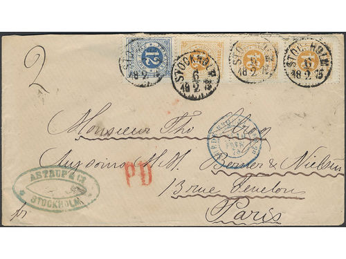Sweden. Facit 21o, 24d on cover, 12+3×24 öre on double rate pre-GPU cover sent from STOCKHOLM 6.2.1875 to France. Scarce combination, three recorded according to Ferdén. Certificate HOW 3 (3,3,4,4) (4×3) 3 (2011). SEK 10000 Show less