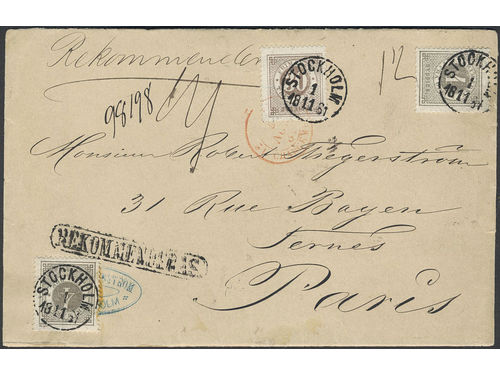 Sweden. Facit 29b, 35e on cover, 2×4+30 öre on superb registered cover sent from STOCKHOLM 1.11.1881 to France. Certificate HOW 4 (3,3,4) (4,4,4) 4 (2002). Show less